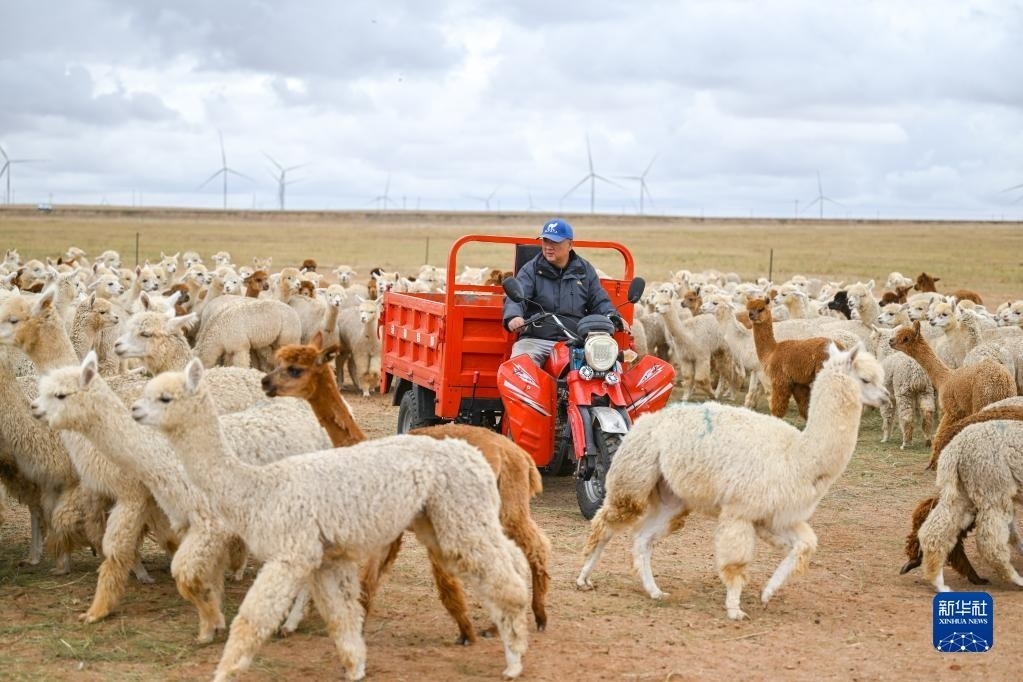 6月1日,巴彥杭蓋嘎查羊駝養(yǎng)殖基地的工作人員在觀察羊駝的飼養(yǎng)情況。