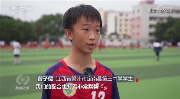 江西省贛州市定南縣第三中學(xué)學(xué)生曾子儒:“踢足球之前自己體弱多病,身體素質(zhì)比較差,別提去踢這么一場(chǎng)激烈的足球比賽,就是讓我圍著操場(chǎng)跑一圈都?xì)獯跤酢!?br>