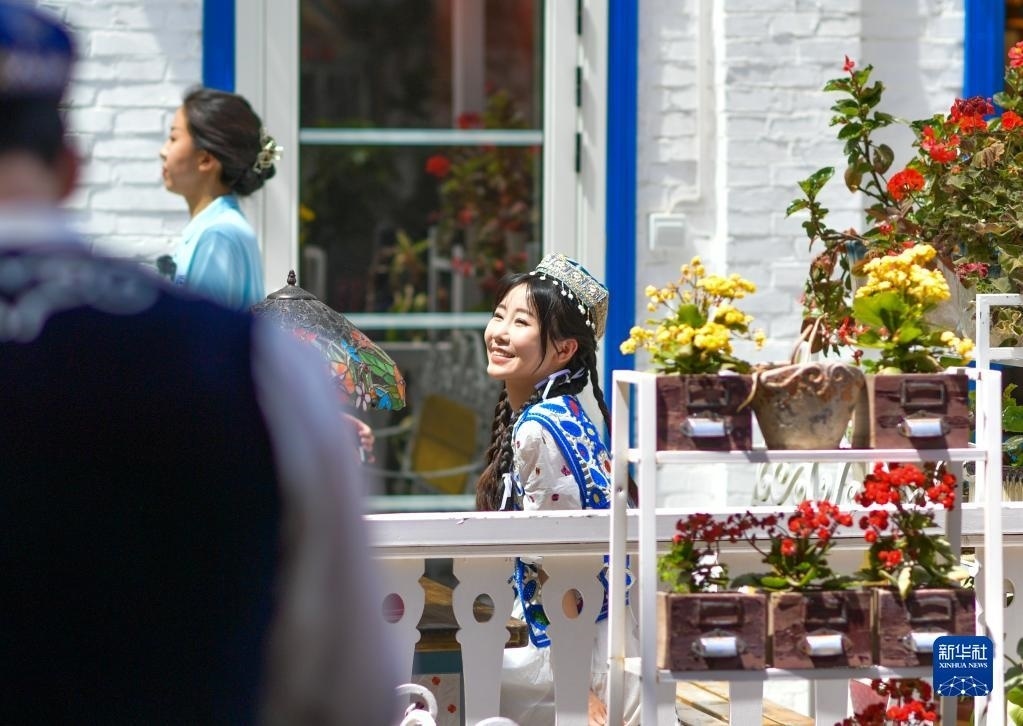 游客在新疆伊寧市六星街拍照留念(5月18日攝)。新華社記者 王菲 攝