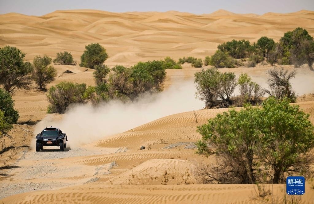 參與2023年中國環(huán)塔(國際)拉力賽的車手駕駛賽車疾馳在新疆和田地區(qū)墨玉縣的沙漠中(5月28日攝)。 新華社記者 胡虎虎 攝