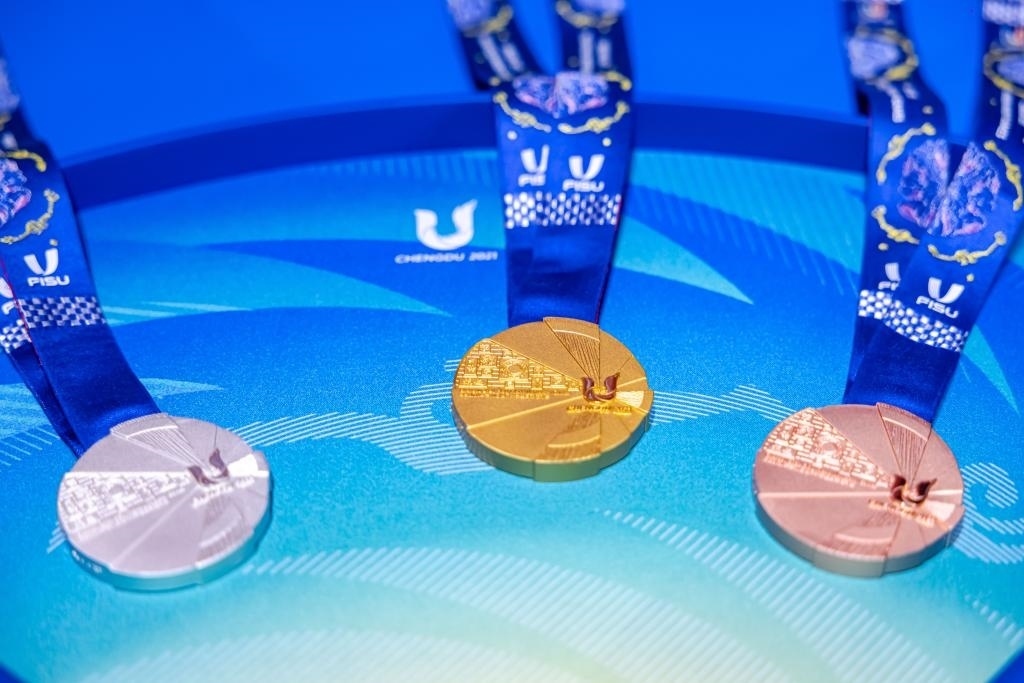 獎牌是每個體育賽事的重要組成部分之一,本屆大運會獎牌根據(jù)國際大體聯(lián)要求,融合成都和國際化傳播元素,最終形成了大運會獎牌“蓉光”。獎牌整體設(shè)計以成都大運會會徽和太陽神鳥為主要靈感,利用幾何扇面代表太陽光芒,傳遞了太陽神鳥守護(hù)夢想的設(shè)計概念。獎牌以“蓉光”為名,諧音為“榮光”,寓意榮耀、光彩,寄托了對大運健兒在成都青春展翅、乘夢而行的美好期許。