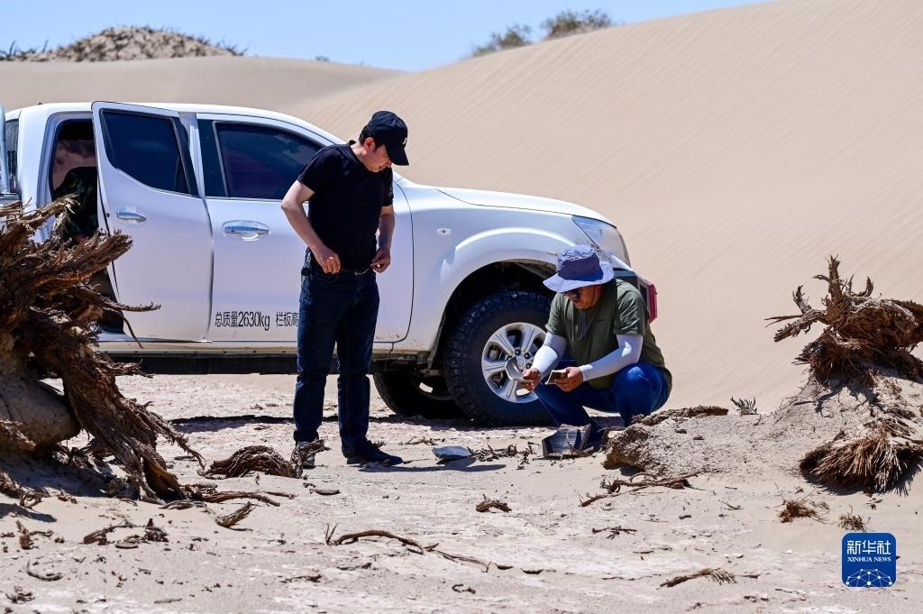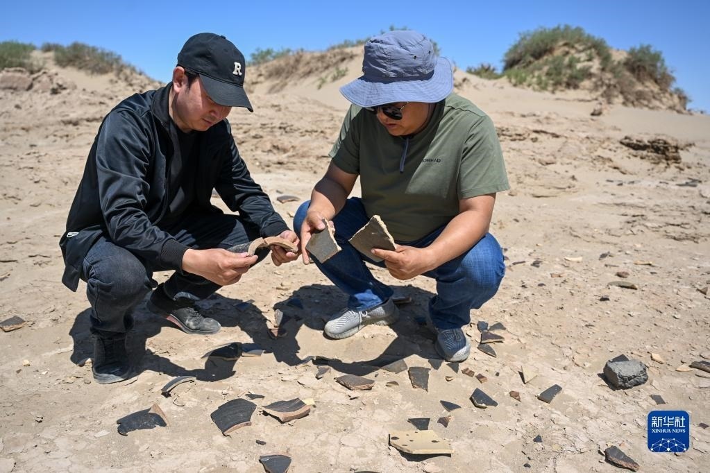 6月2日,額濟納旗文物保護中心工作人員在居延遺址附近查看散落的陶片。