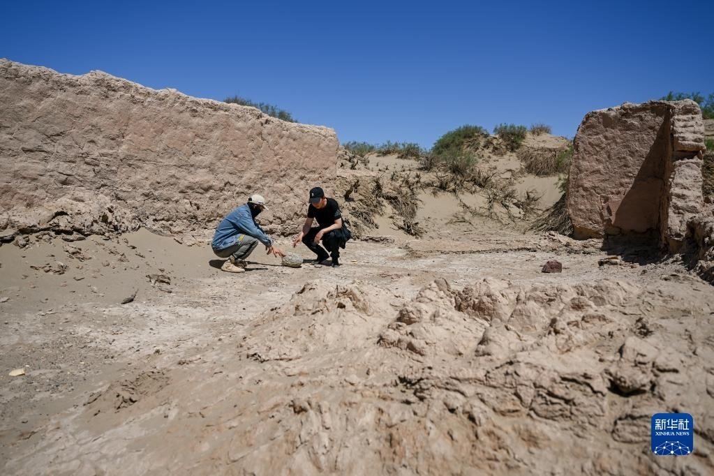 6月2日,額濟納旗文物保護中心工作人員在居延遺址附近查看散落的石碾。