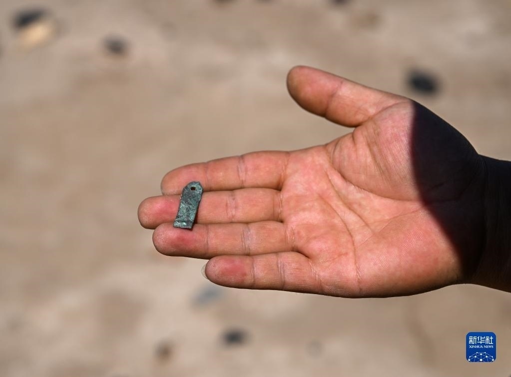 這是額濟納旗文物保護中心工作人員在巡護中發(fā)現(xiàn)的銅片(6月2日攝)。
