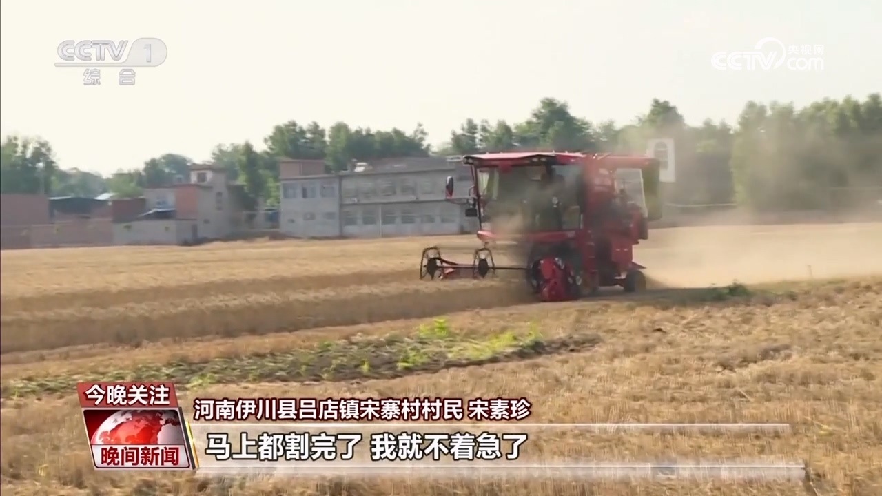 伊川縣呂店鎮(zhèn)宋寨村村民 宋素珍:前幾天下雨小麥?zhǔn)詹换貋?,心里可心慌,鄉(xiāng)里派履帶式收割機(jī),我這十幾畝地馬上都挨?。ㄝ喌剑┝耍R上都割完了,我就不著急了。