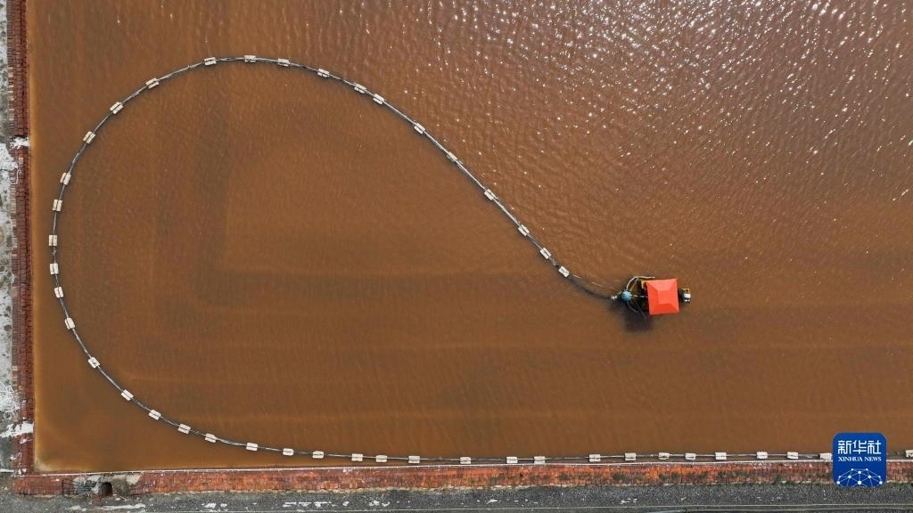 6月4日,工人操作設(shè)備在唐山海港經(jīng)濟開發(fā)區(qū)長蘆大清河鹽場收獲海鹽(無人機照片)。