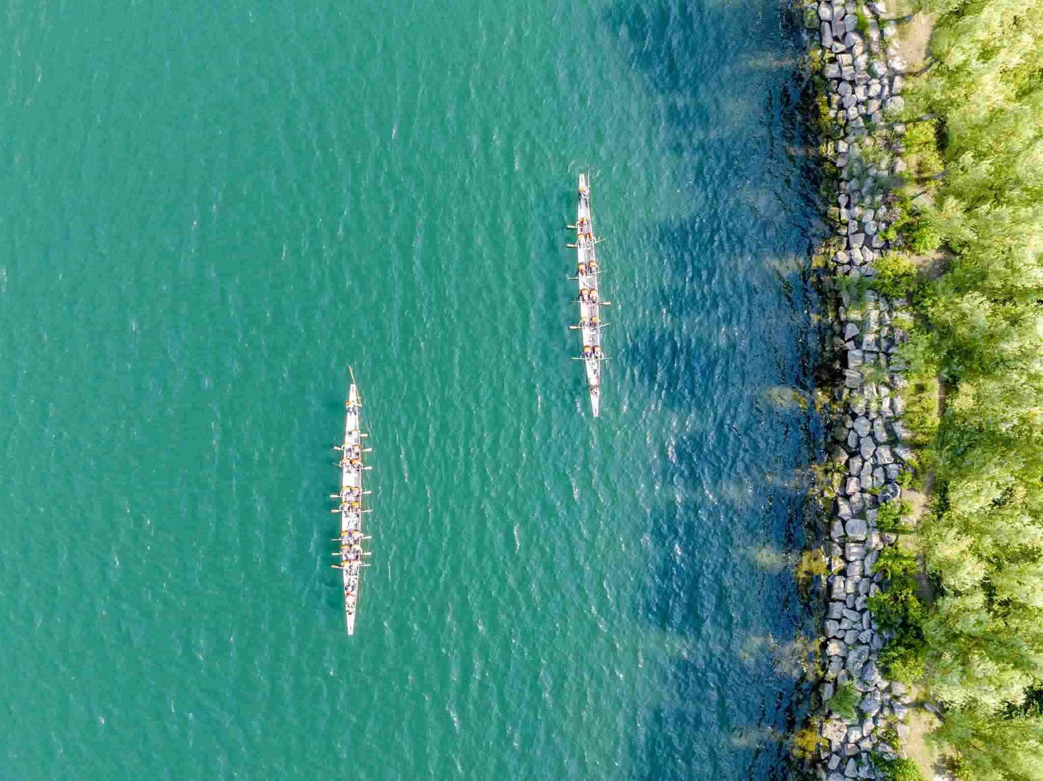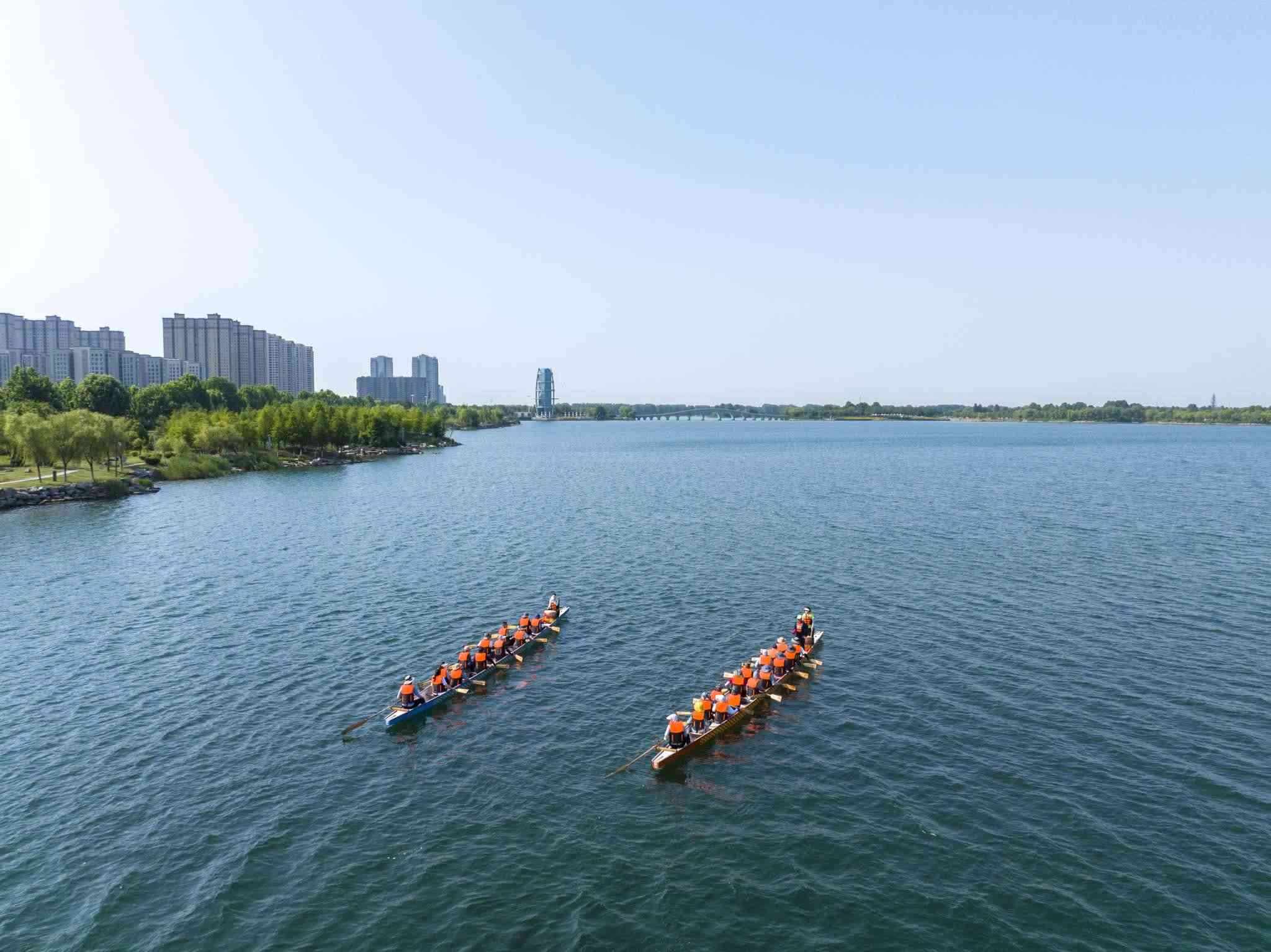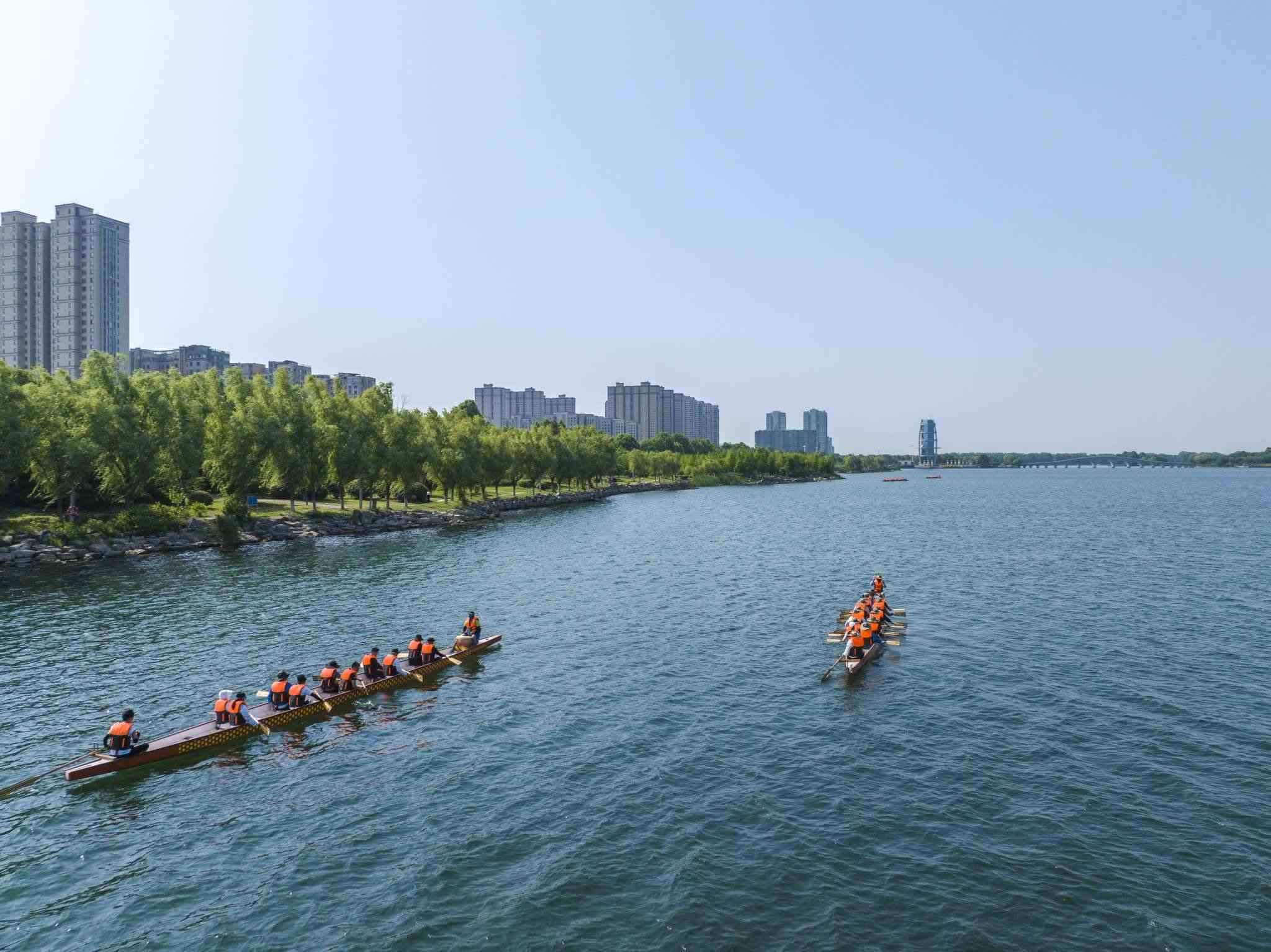 2023年6月8日,江蘇連云港,東??h西雙湖風(fēng)景區(qū),多支龍舟隊在西雙湖水域進(jìn)行訓(xùn)練,積極備戰(zhàn)端午龍舟賽。視覺中國