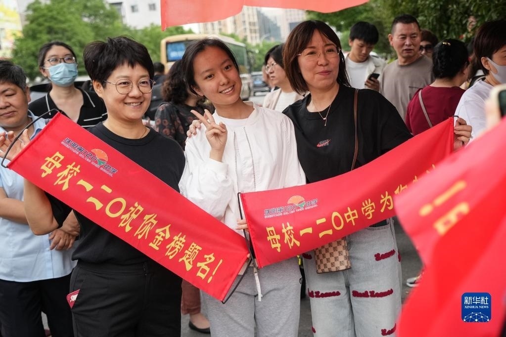 6月7日,考生在遼寧省實(shí)驗(yàn)中學(xué)考點(diǎn)外與老師合影留念。