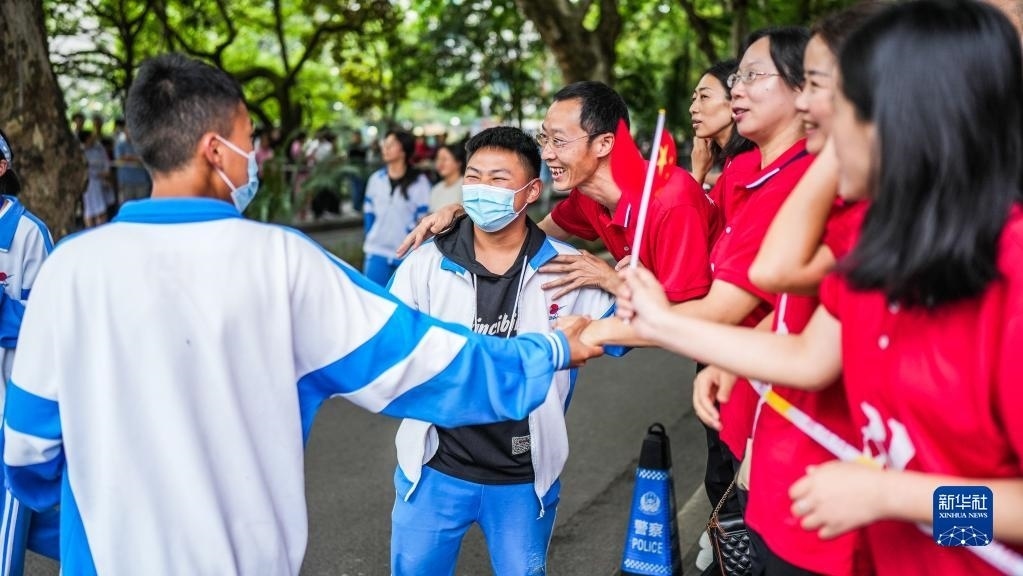 6月7日,在吉林省長(zhǎng)春市五十六中學(xué)考點(diǎn),考生入場(chǎng)前與送考老師擊掌。