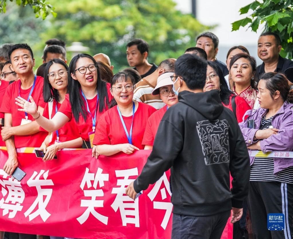6月7日,送考老師在貴陽(yáng)市烏當(dāng)中學(xué)考點(diǎn)給學(xué)生加油打氣。
