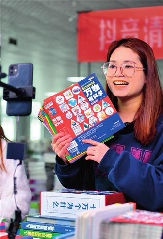 廊坊市永清經(jīng)濟(jì)開發(fā)區(qū)京聯(lián)集團(tuán)館配圖書聯(lián)合現(xiàn)采基地,工作人員在電商平臺直播銷售圖書(2023年3月26日攝)。駱學(xué)峰攝/本刊