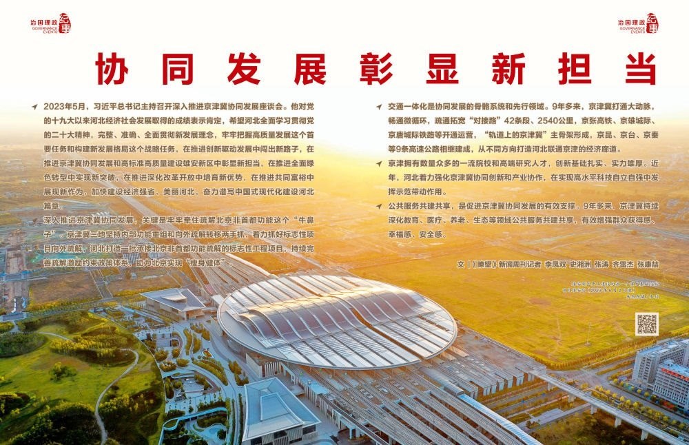 ◇2023年5月,習(xí)近平總書記主持召開深入推進(jìn)京津冀協(xié)同發(fā)展座談會。他對黨的十九大以來河北經(jīng)濟(jì)社會發(fā)展取得的成績表示肯定,希望河北全面學(xué)習(xí)貫徹黨的二十大精神,完整、準(zhǔn)確、全面貫徹新發(fā)展理念,牢牢把握高質(zhì)量發(fā)展這個首要任務(wù)和構(gòu)建新發(fā)展格局這個戰(zhàn)略任務(wù),在推進(jìn)創(chuàng)新驅(qū)動發(fā)展中闖出新路子,在推進(jìn)京津冀協(xié)同發(fā)展和高標(biāo)準(zhǔn)高質(zhì)量建設(shè)雄安新區(qū)中彰顯新?lián)?dāng),在推進(jìn)全面綠色轉(zhuǎn)型中實(shí)現(xiàn)新突破,在推進(jìn)深化改革開放中培育新優(yōu)勢,在推進(jìn)共同富裕中展現(xiàn)新作為,加快建設(shè)經(jīng)濟(jì)強(qiáng)省、美麗河北,奮力譜寫中國式現(xiàn)代化建設(shè)河北篇章。