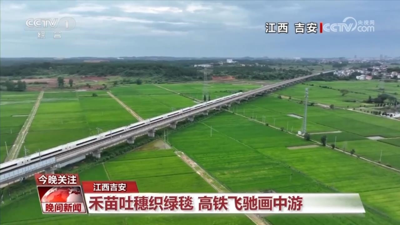 跟隨疾馳的高鐵,飛至江西吉安這片稻田的上空。早早種下的水稻,已經(jīng)進(jìn)入抽穗期。飛馳的高鐵從一塊塊綠毯中呼嘯而過(guò),驚起層層稻浪。這是工業(yè)與農(nóng)業(yè)的交響,這是快與慢的彼此致敬。再過(guò)二十多天,這片綠色的田野,將回饋黃澄澄、沉甸甸的稻谷。
