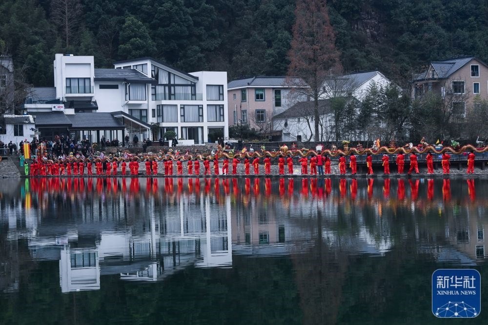 浙江杭州市富陽區(qū)湖源鄉(xiāng)窈口村女子板龍隊(duì)在進(jìn)行板凳龍舞龍表演(2月1日攝)。湖源鄉(xiāng)是個(gè)群山環(huán)抱、青山綠水、生態(tài)秀美的山區(qū)鄉(xiāng)鎮(zhèn),近年來,湖源緊抓機(jī)遇,圍繞“樂水湖源、龍鱗+”發(fā)展目標(biāo),立足山水特色,錨定發(fā)展綠色經(jīng)濟(jì),打造獨(dú)具特色的鄉(xiāng)村旅游品牌。新華社記者 徐昱 攝