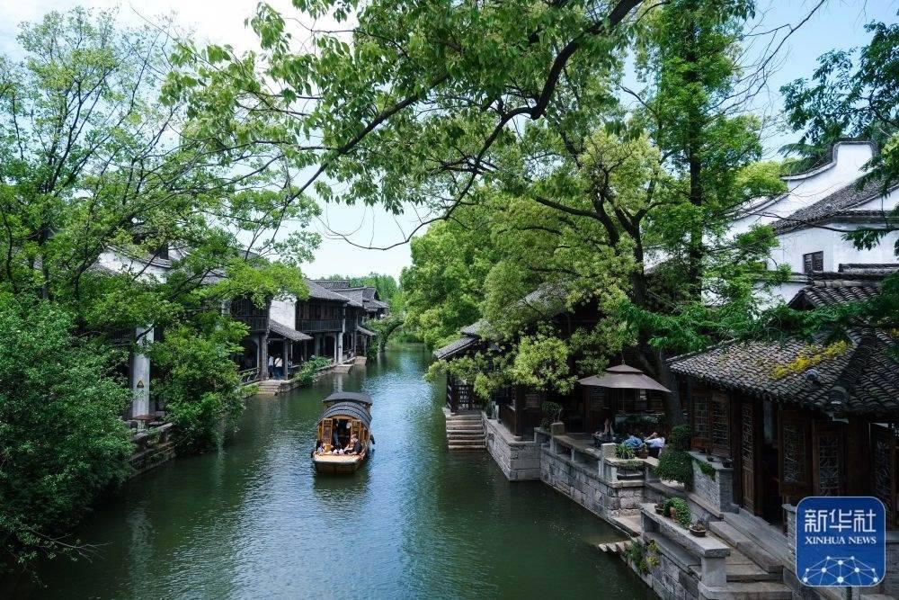 游客乘船在浙江嘉興桐鄉(xiāng)市濮院鎮(zhèn)的濮院時(shí)尚古鎮(zhèn)游覽(5月2日攝)。濮院時(shí)尚古鎮(zhèn)以“歷史街區(qū)再利用”的概念經(jīng)過10年的升級(jí)改造而成,擁有典型的江南水鄉(xiāng)地貌特征,成功創(chuàng)建為浙江省級(jí)5A級(jí)景區(qū)鎮(zhèn)。新華社記者 徐昱 攝