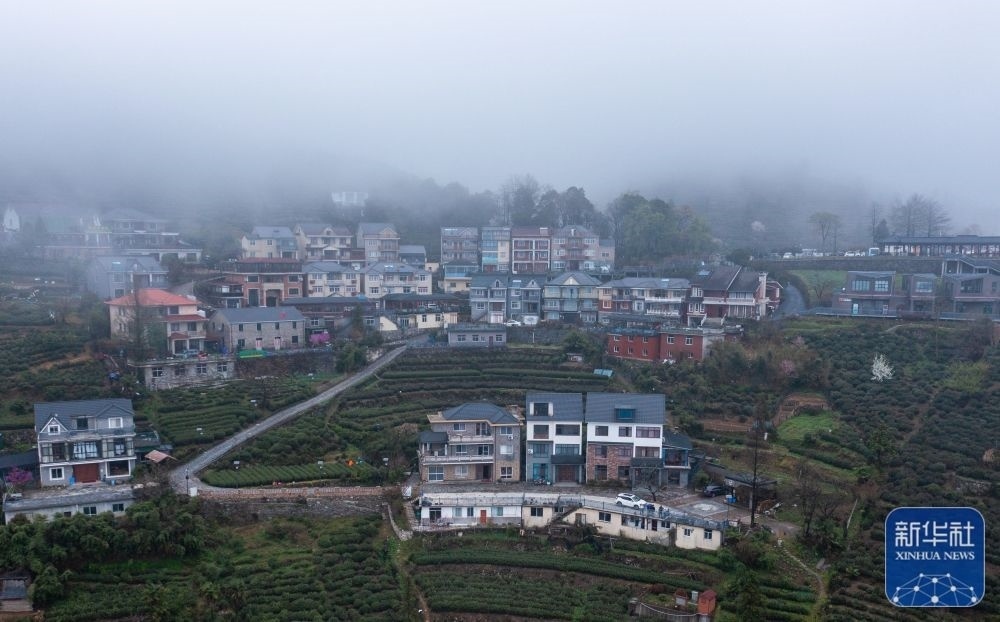 空中俯瞰云霧中的浙江杭州富陽里山鎮(zhèn)安頂村(3月23日攝,無人機(jī)照片)。安頂村海拔700多米,一年中有200多天可觀賞“安頂云?!逼婢埃?dāng)?shù)匕傩找劳懈呱皆旗F茶以及特色鄉(xiāng)村旅游產(chǎn)業(yè),走出了一條茶旅融合的新農(nóng)村共同富裕發(fā)展模式。新華社記者 徐昱 攝