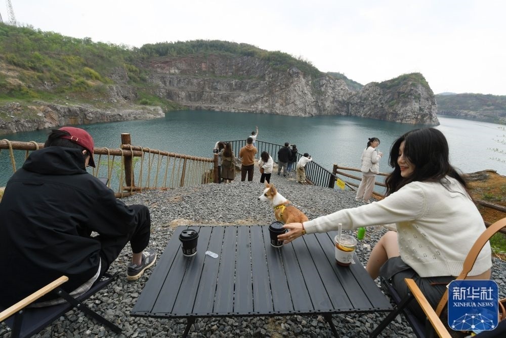 游客在浙江湖州市安吉縣梅溪鎮(zhèn)紅廟村一家建于廢棄礦坑旁的咖啡館休閑(4月7日攝)。新華社記者 翁忻旸 攝