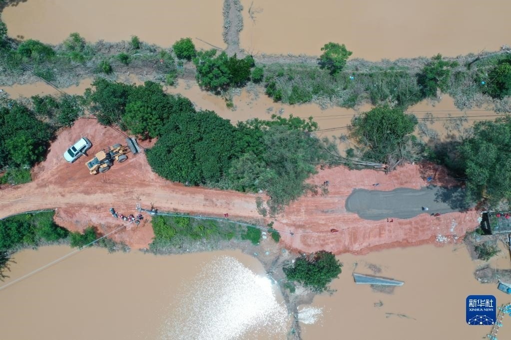 6月11日,在廣西合浦縣白沙鎮(zhèn),工人在施工修復(fù)遭洪水損毀的堤壩(無(wú)人機(jī)照片)。   新華社記者 陸波岸 攝