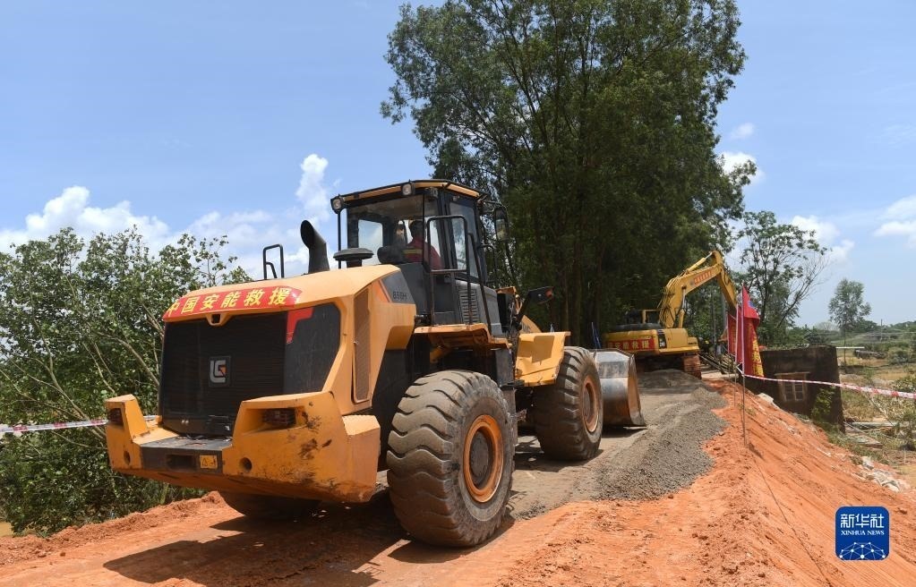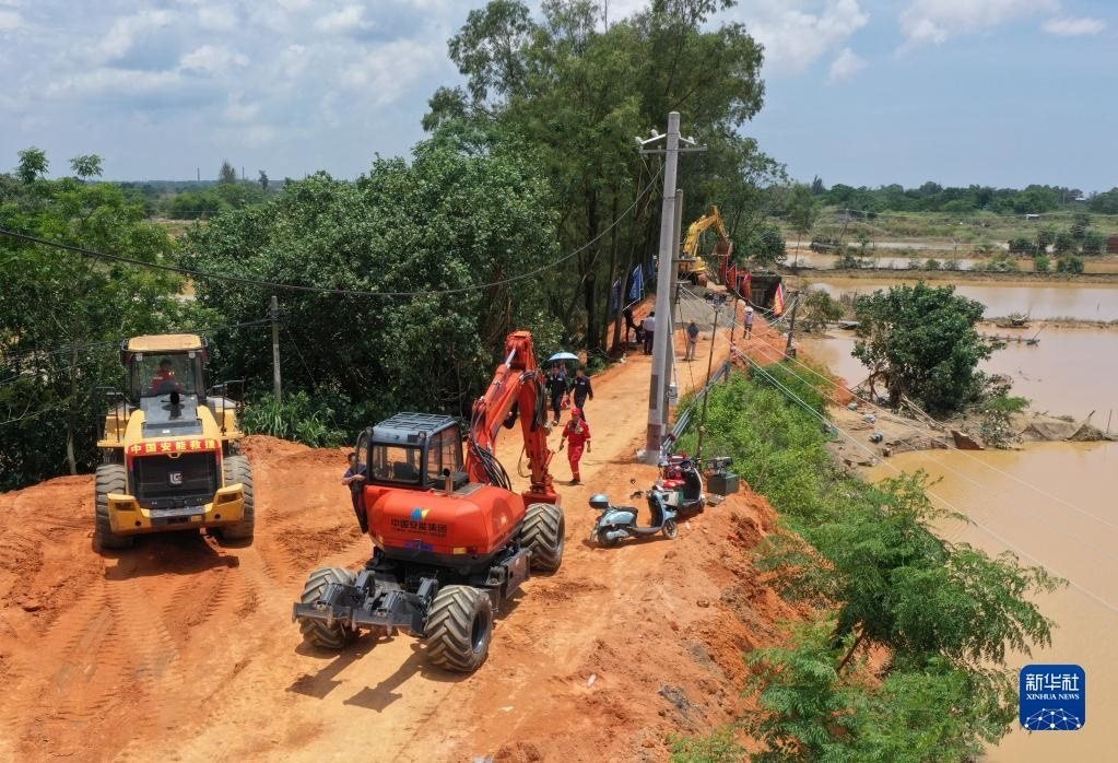 6月11日,在廣西合浦縣白沙鎮(zhèn),工人在施工修復(fù)遭洪水損毀的堤壩。   新華社記者 陸波岸 攝