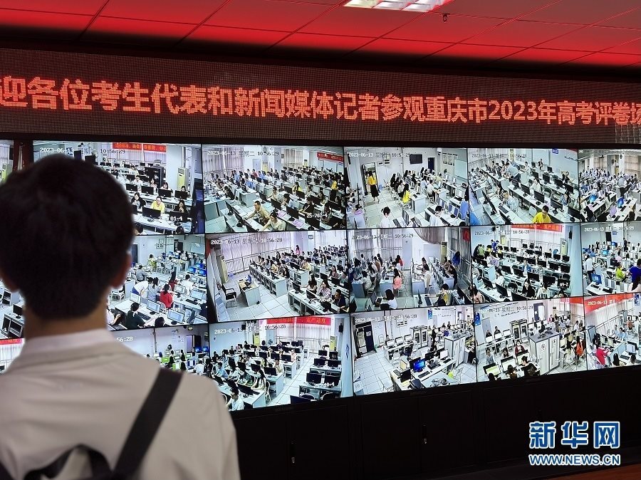 工作人員通過視頻查看閱卷現(xiàn)場情況。新華網(wǎng) 彭浩然 攝