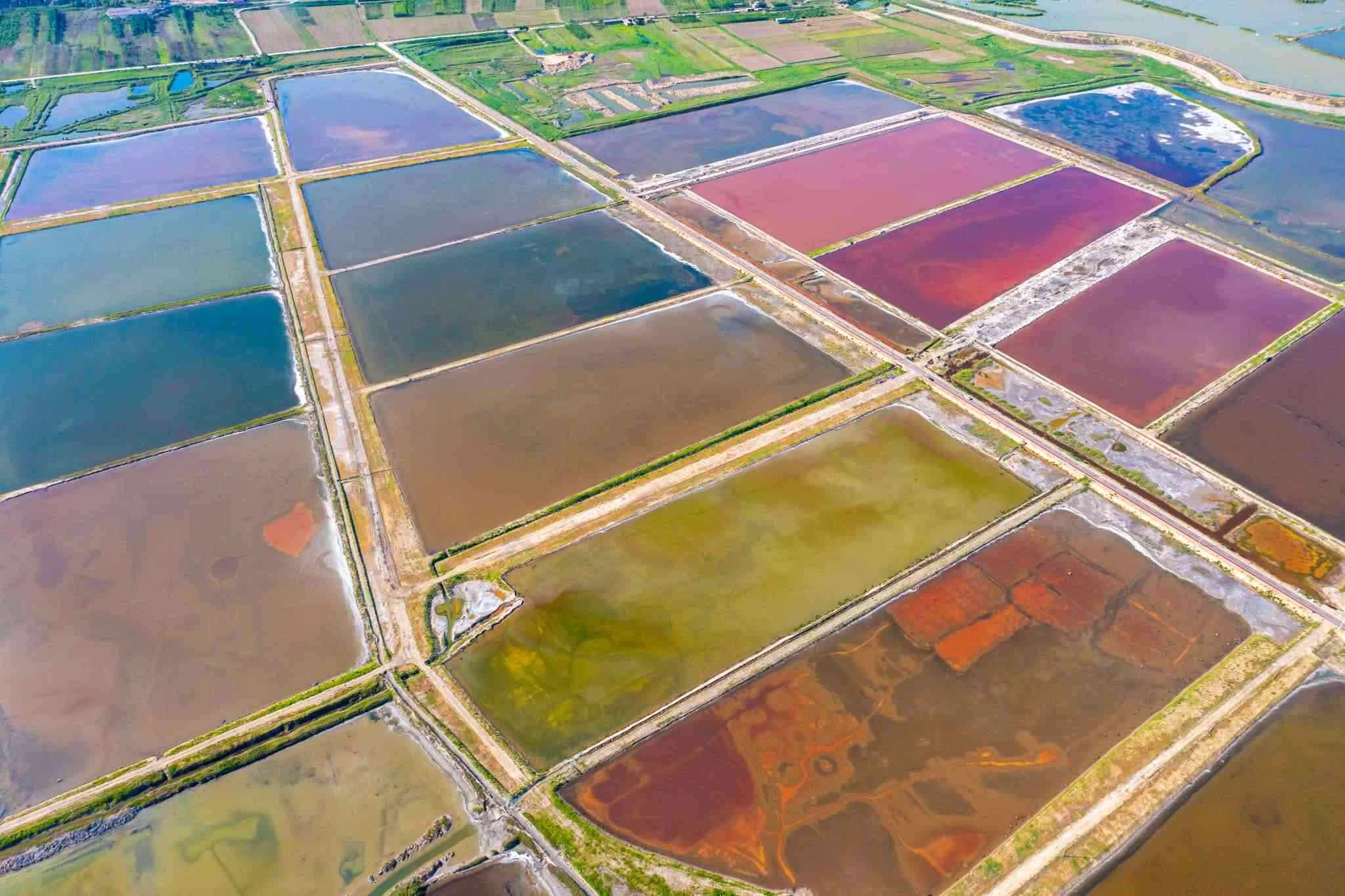 2023年6月14日,山西運(yùn)城,七彩鹽湖呈現(xiàn)出色彩斑斕的景觀,猶如大地調(diào)色板,美不勝收。視覺中國(guó)