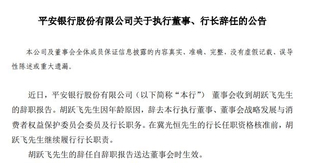 6月9日,平安銀行發(fā)布公告,原行長胡躍飛辭職。這位已在平安工作了數(shù)十年的“老將”因年齡原因辭去該行執(zhí)行董事、董事會戰(zhàn)略發(fā)展與消費者權(quán)益保護委員會委員及行長職務。