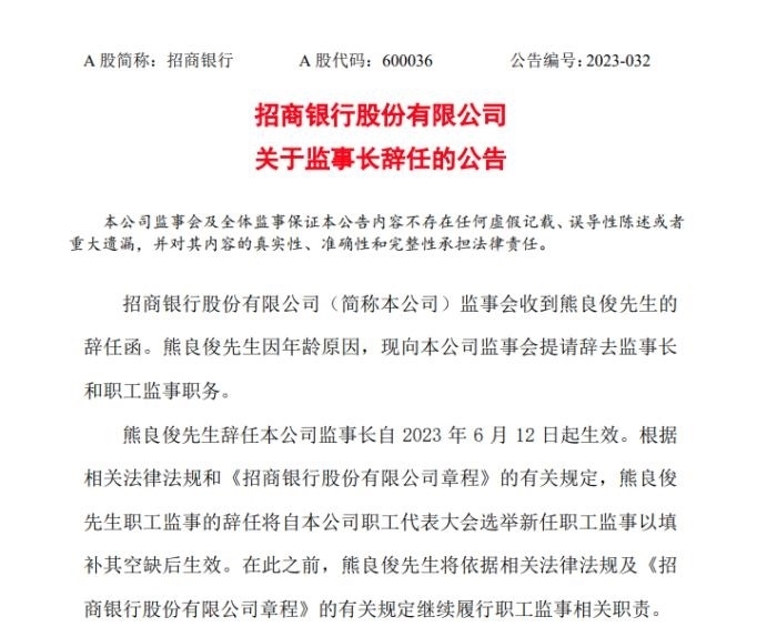 同在13日,招商銀行發(fā)布公告,該行監(jiān)事長熊良俊因年齡原因辭任。招商銀行表示,熊良俊自2021年8月起擔任招商銀行監(jiān)事長。