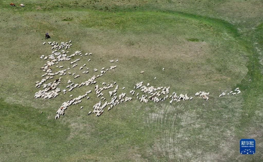 6月15日,羊群在草原上覓食(無人機(jī)照片)。
