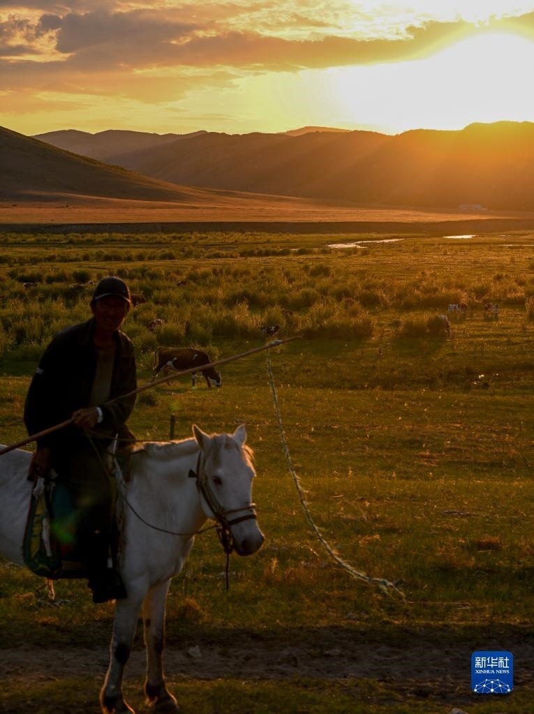 6月14日,在阿魯科爾沁草原,牧民騎馬放牧。