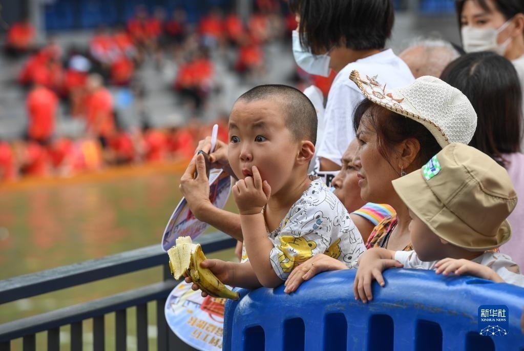 6月15日,小朋友被精彩的車(chē)陂龍舟賽吸引。