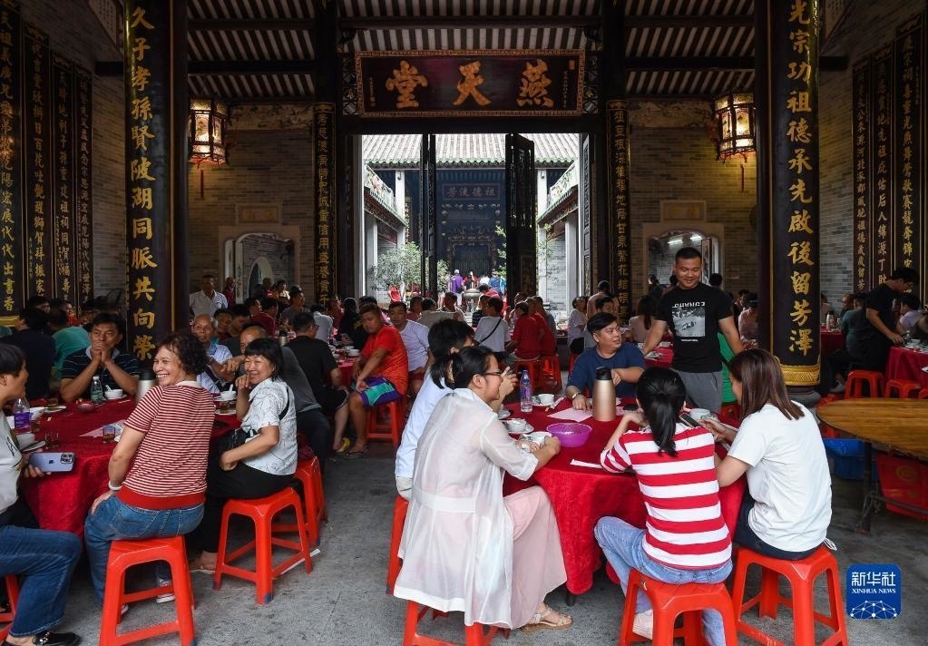 6月15日,2023年車(chē)陂龍舟競(jìng)渡第一名“范陽(yáng)簡(jiǎn)”龍船會(huì)在簡(jiǎn)氏家祠里擺下幾十桌龍船飯慶祝。