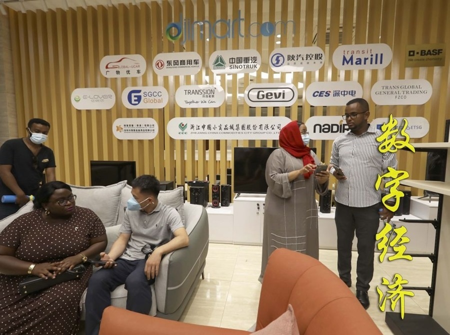 烏干達青年企業(yè)家迪莉婭(前左)在吉布提國際自貿區(qū)跨境電商平臺展示區(qū)與中方人員交流(2022年9月14日攝)。