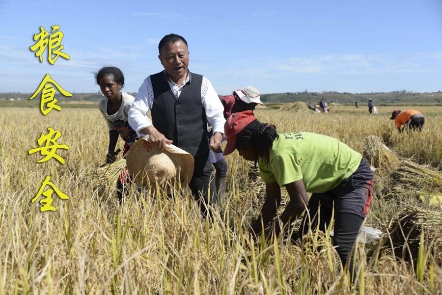 在馬達加斯加首都塔那那利佛附近的馬義奇鎮(zhèn),中國雜交水稻技術專家胡月舫(左二)在中國國家雜交水稻工程技術研究中心非洲分中心的試驗田里和當?shù)剞r民交流(2023年5月12日攝)。目前,中國雜交水稻在馬達加斯加累計推廣面積已達5萬多公頃,平均每公頃產量可達7.5噸左右。馬達加斯加距離實現(xiàn)糧食自給自足的目標邁近了一大步。