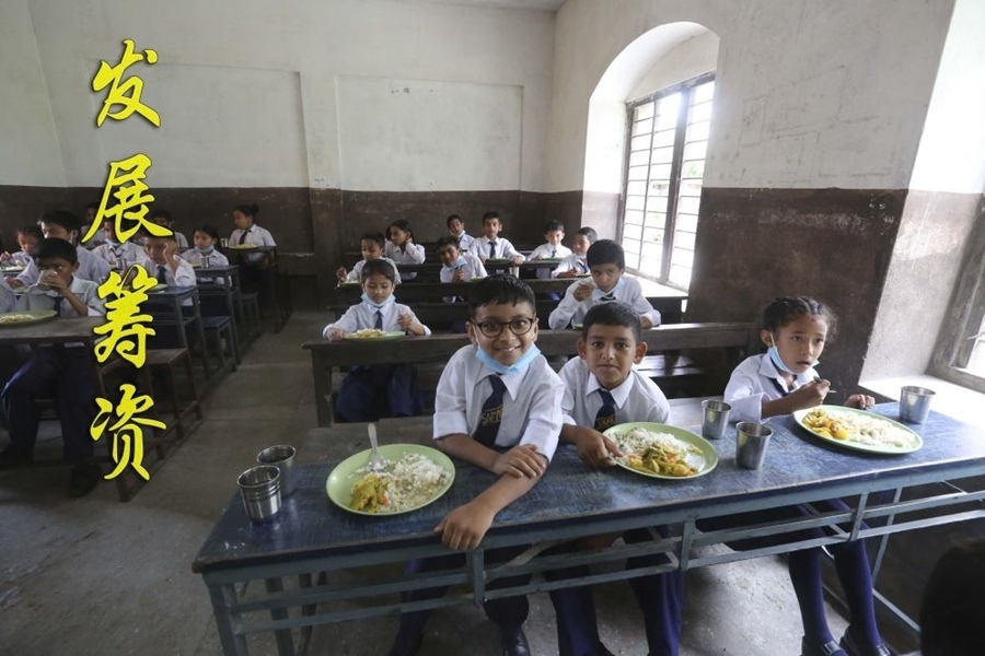 在尼泊爾加德滿都,學生們參加微笑兒童項目啟動儀式并就餐(2022年7月11日攝)。由“全球發(fā)展和南南合作基金”支持的微笑兒童項目惠及約3600名尼泊爾學生,解決學生就餐問題。