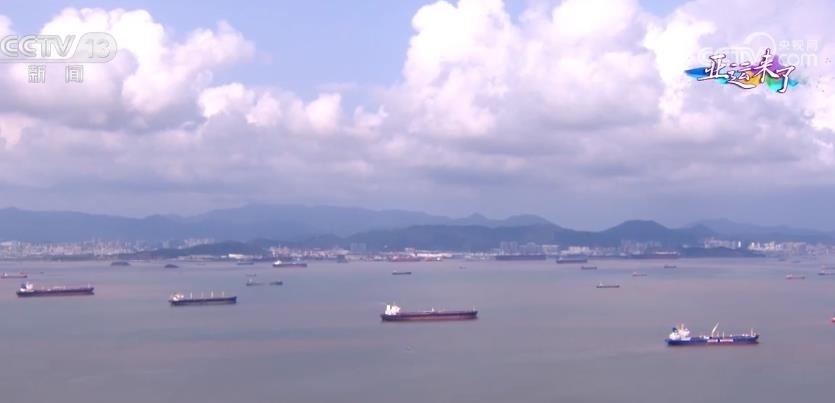 我們飛越兩座亞運(yùn)場(chǎng)館,將要看到的就是寧波最閃亮的名片之一:寧波舟山港。繁忙是這座港口的常態(tài)。當(dāng)我們的直升機(jī)遠(yuǎn)遠(yuǎn)地飛行,還沒(méi)有靠近港口的時(shí)候,就能先看到港口外的這片海域——洋小貓水域,這里是船舶經(jīng)南航道進(jìn)出寧波舟山港核心港區(qū)的一條必經(jīng)之路。向下看,大家可以看到海面上星星點(diǎn)點(diǎn)的船只,來(lái)自全球各地滿(mǎn)載商品貨物的遠(yuǎn)洋船舶在這里交匯。