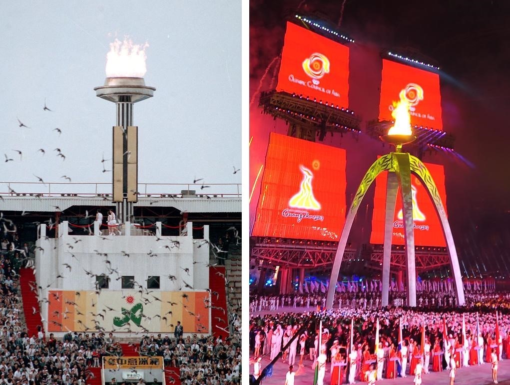 左圖:1990年9月22日,第十一屆亞運(yùn)會(huì)開(kāi)幕式在北京工人體育場(chǎng)舉行。