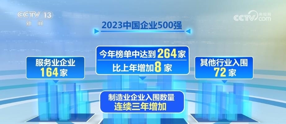 9月20日,中國(guó)企業(yè)聯(lián)合會(huì)發(fā)布了“2023中國(guó)企業(yè)500強(qiáng)”榜單。2023中國(guó)企業(yè)500強(qiáng)中,制造業(yè)企業(yè)入圍數(shù)量連續(xù)三年增加,2023年榜單中達(dá)到264家,比上年增加8家,服務(wù)業(yè)企業(yè)164家,其他行業(yè)入圍72家。從換榜情況來(lái)看,有48家新入圍或重新入圍企業(yè),這些企業(yè)中,制造業(yè)有28家,占比58.33%。