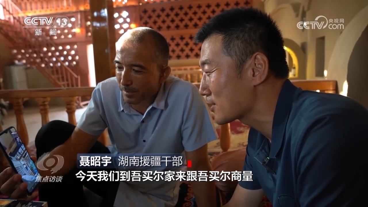 湖南援疆干部聶昭宇:“今天我們到吾買爾家跟吾買爾商量,在他們門前搞一個電商帶貨大比拼,現(xiàn)在這個村每天來了不少人,我們覺得前景挺好。”