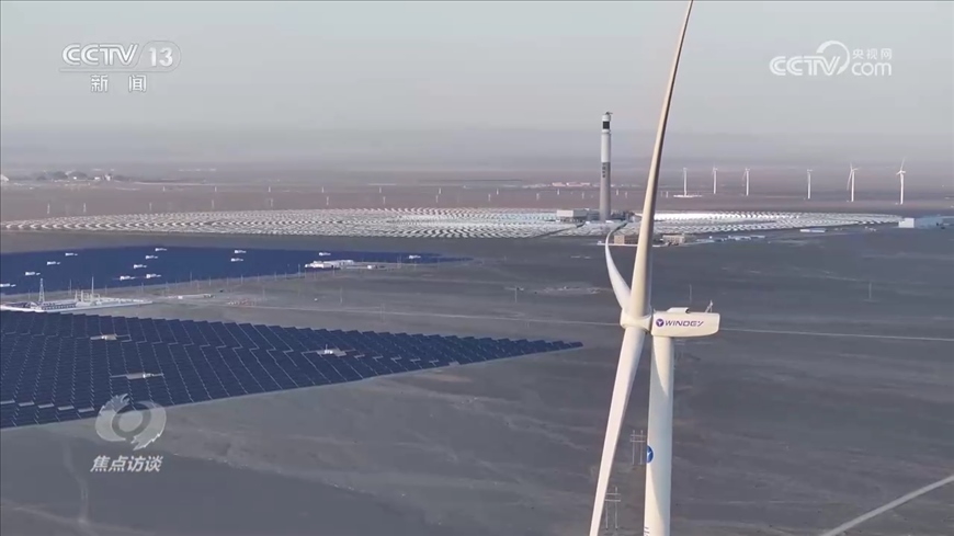 新疆生產(chǎn)建設(shè)兵團(tuán)第十三師新星市發(fā)改委主任龍剛:“我們新星市光伏和風(fēng)電的裝機(jī)總?cè)萘窟_(dá)到了240萬千瓦,2022年風(fēng)電和光伏總發(fā)電量是38億度電,相當(dāng)于減排二氧化碳300萬噸左右?!?/p>