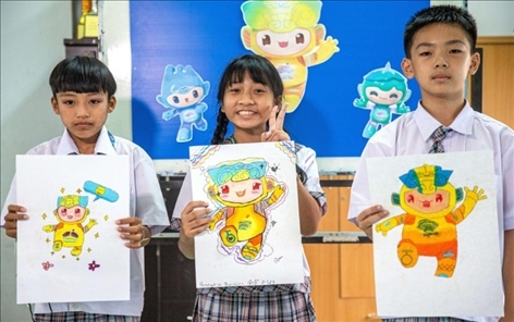 學(xué)生展示畫完的杭州亞運(yùn)會(huì)吉祥物。新華社記者 王騰 攝