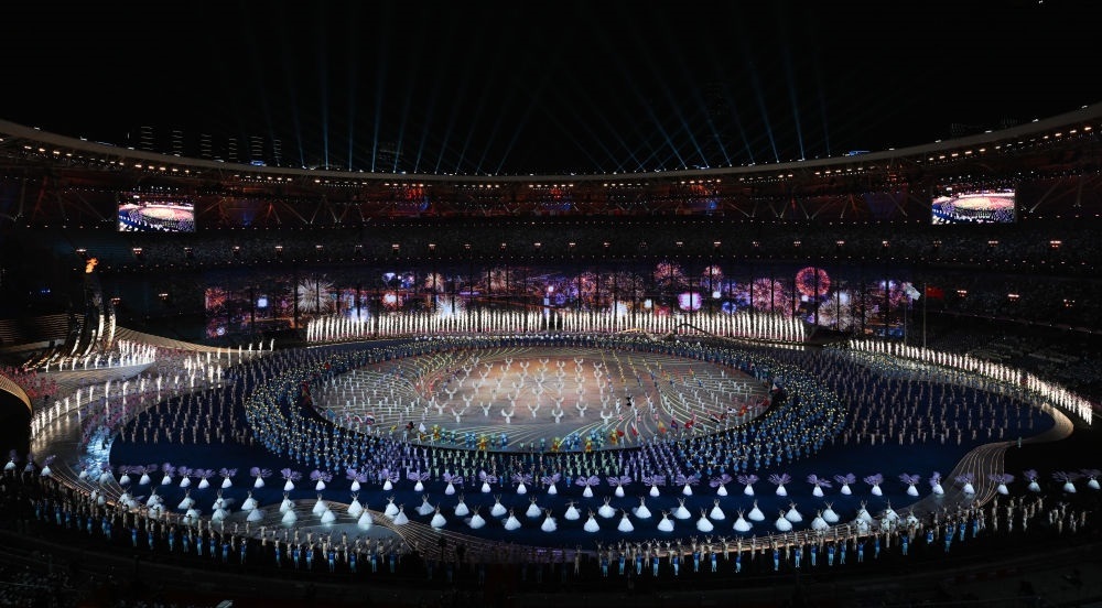 中國農(nóng)歷秋分節(jié)氣,杭州奧體中心體育場“大蓮花”燈光璀璨,萬涓成水,奔涌成潮?!皵?shù)字火炬手”與游泳運(yùn)動員汪順共同點(diǎn)燃了象征亞洲大團(tuán)結(jié)的體育之火,杭州第十九屆亞運(yùn)會開幕。