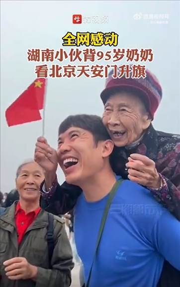 近日,湖南一名男子背著95歲的奶奶,從永州出發(fā)到北京天安門看升國(guó)旗??粗逍羌t旗冉冉升起,祖孫兩人露出了幸福的笑容。網(wǎng)友:這是“最美的風(fēng)景”。