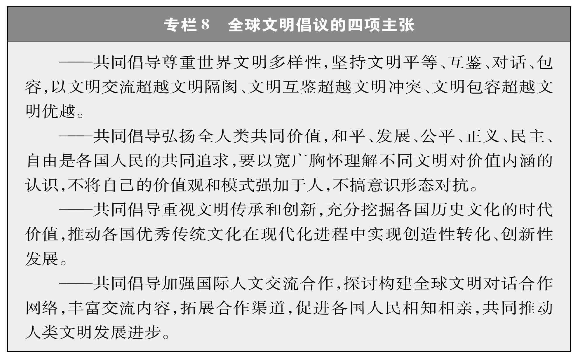 ——中國提出全球文明倡議,共同倡導(dǎo)尊重世界文明多樣性,共同倡導(dǎo)弘揚(yáng)全人類共同價值,共同倡導(dǎo)重視文明傳承和創(chuàng)新,共同倡導(dǎo)加強(qiáng)國際人文交流合作。全球文明倡議向全世界發(fā)出增進(jìn)文明交流對話、在包容互鑒中促進(jìn)人類文明進(jìn)步的真摯呼吁,為推動構(gòu)建人類命運(yùn)共同體注入了精神動力。
