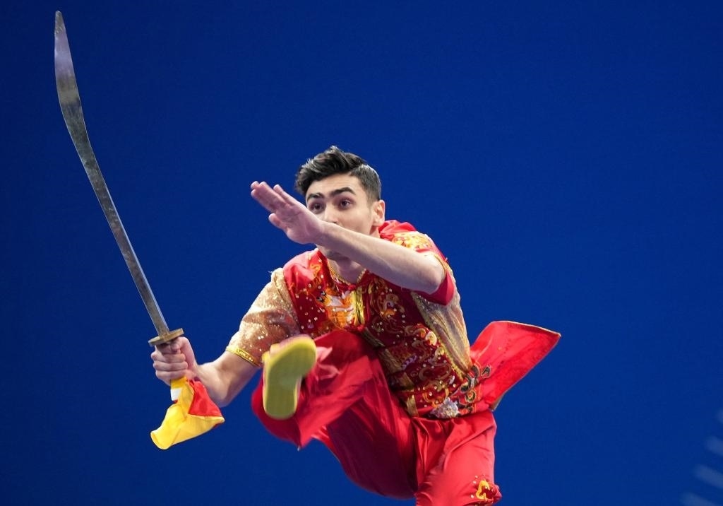 9月27日,伊朗選手侯賽因·蓋卜萊納邁·穆加達(dá)姆在刀術(shù)比賽中。當(dāng)日,杭州亞運(yùn)會武術(shù)男子刀術(shù)棍術(shù)全能決賽在杭州蕭山瓜瀝文化體育中心舉行。新華社記者 李一博 攝
