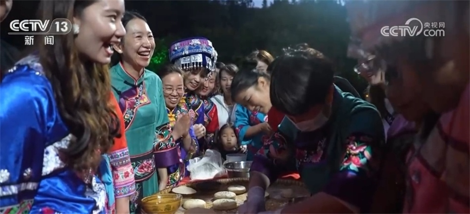 隨著歡快的音樂響起,當?shù)卮迕翊┥仙术r艷的節(jié)日盛裝,踏著鼓點,圍著篝火跳起土家擺手舞,豐收的喜悅洋溢在村民們的臉上,游客們加入其中,大家手牽著手,共同舞出金秋和美鄉(xiāng)村新畫卷。
