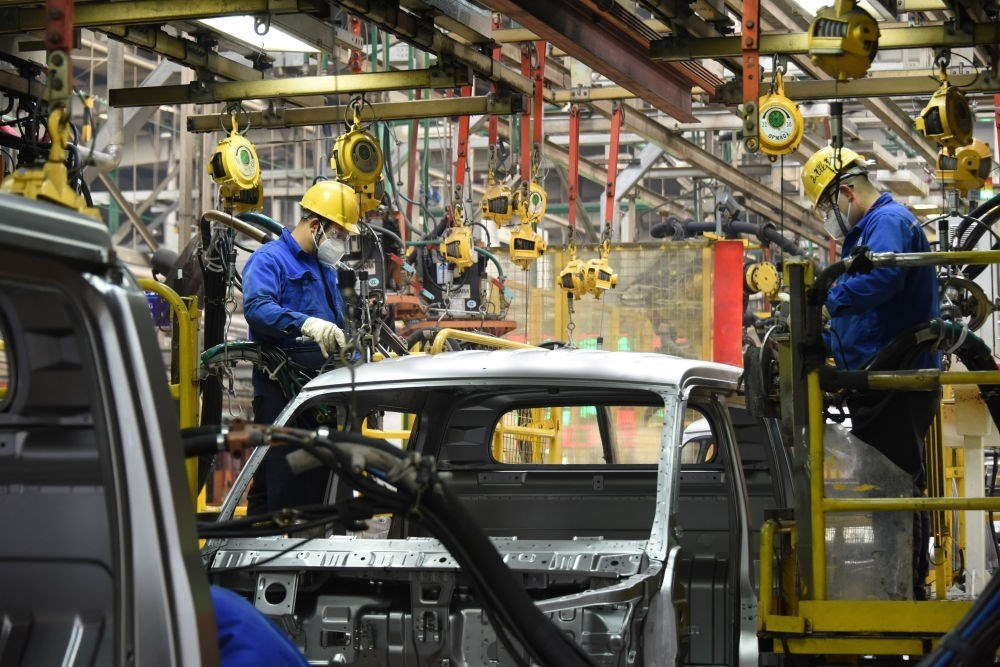 工人在山東自貿(mào)試驗區(qū)青島片區(qū)一汽車制造企業(yè)車間內(nèi)生產(chǎn)汽車(2023年2月23日攝)。新華社記者 李紫恒 攝