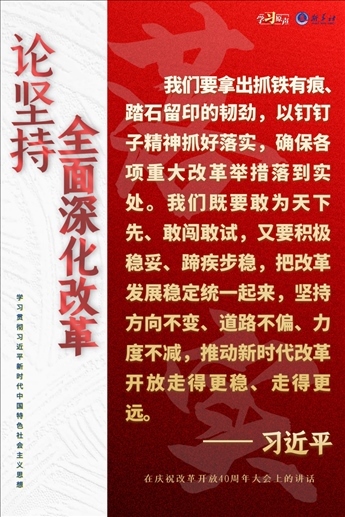 實(shí)現(xiàn)新時(shí)代新征程的目標(biāo)任務(wù),要把全面深化改革作為推進(jìn)中國(guó)式現(xiàn)代化的根本動(dòng)力,作為穩(wěn)大局、應(yīng)變局、開(kāi)新局的重要抓手,把準(zhǔn)方向、守正創(chuàng)新、真抓實(shí)干,在新征程上譜寫(xiě)改革開(kāi)放新篇章。