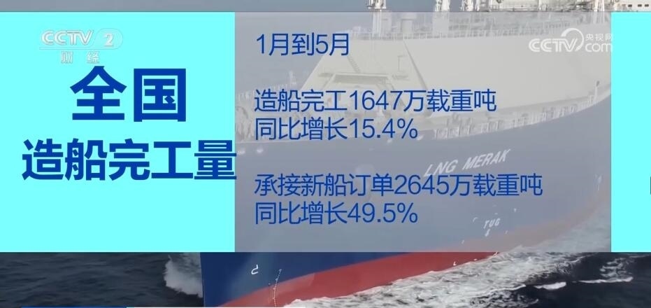 今年1—5月,全國造船完工1647萬載重噸,同比增長15.4%;承接新船訂單2645萬載重噸,同比增長49.5%。5月底,手持船舶訂單11799萬載重噸,同比增長15.5%。綠色船舶理念正逐步貫穿船舶的設計建造全過程,成為中國造船業(yè)一張響亮的“名片”。
