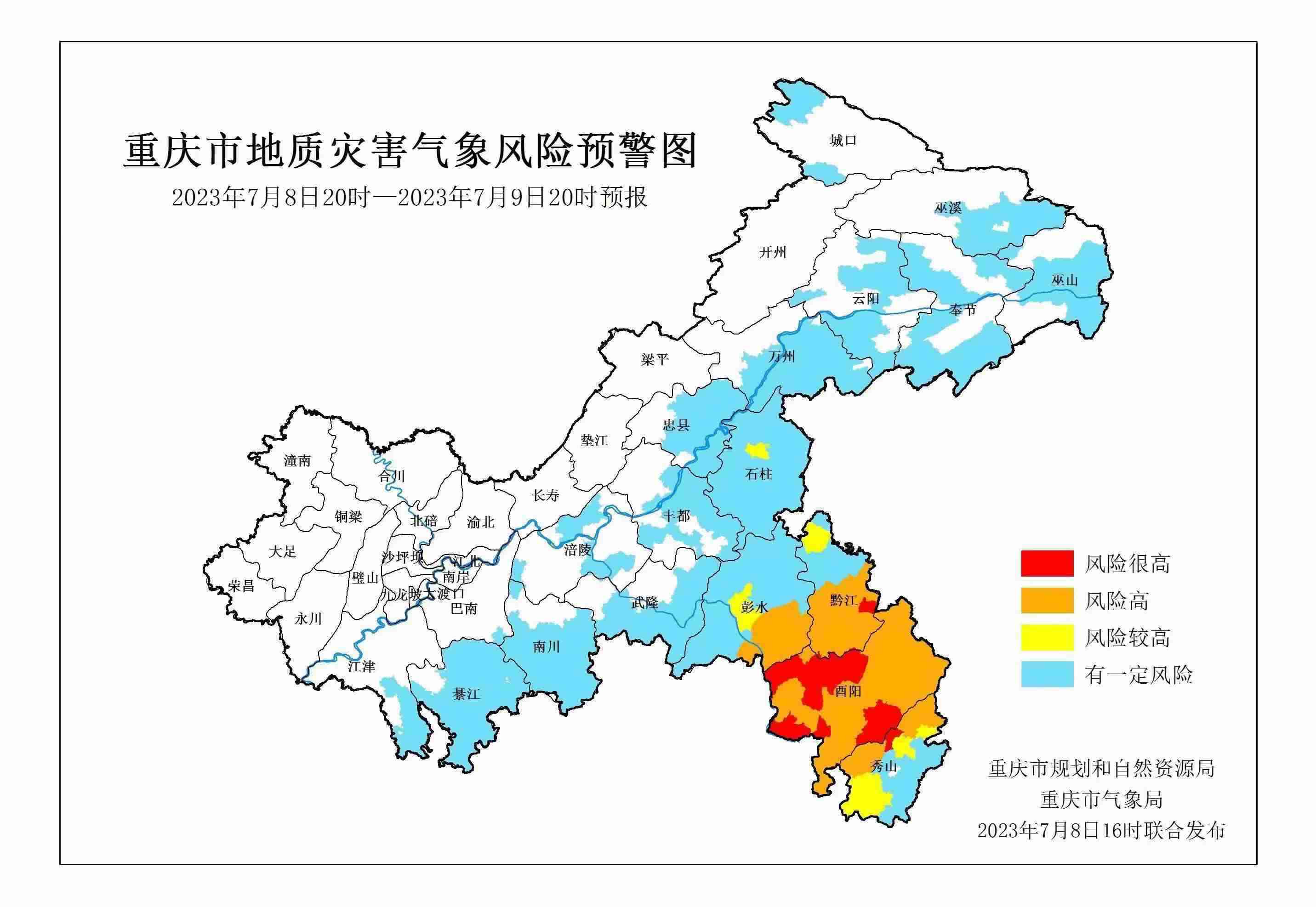 7月8日20時至7月9日20時,酉陽縣、秀山縣、黔江區(qū)屬于風(fēng)險很高地區(qū),地質(zhì)災(zāi)害氣象風(fēng)險等級為I級(紅色預(yù)警),彭水縣屬于風(fēng)險高地區(qū),地質(zhì)災(zāi)害氣象風(fēng)險等級為Ⅱ級(橙色預(yù)警),石柱縣屬于風(fēng)險較高地區(qū),地質(zhì)災(zāi)害氣象風(fēng)險等級為Ⅲ級(黃色預(yù)警),城口縣、萬州區(qū)、云陽縣、巫山縣、巫溪縣、奉節(jié)縣、忠縣、涪陵區(qū)、豐都縣、江津區(qū)、綦江區(qū)、萬盛經(jīng)開區(qū)、南川區(qū)、武隆區(qū)、巴南區(qū)屬于有一定風(fēng)險地區(qū),地質(zhì)災(zāi)害氣象風(fēng)險等級為Ⅳ級(藍(lán)色預(yù)警)。