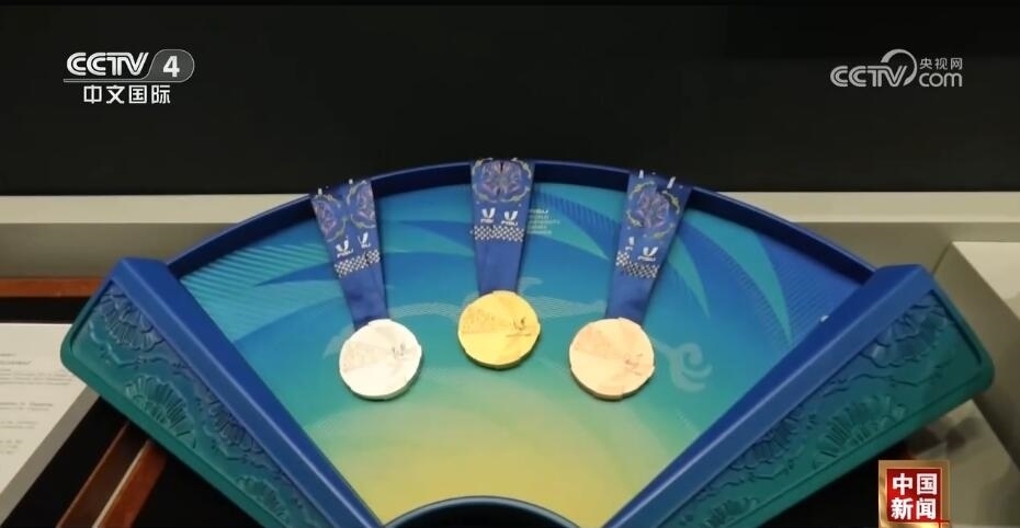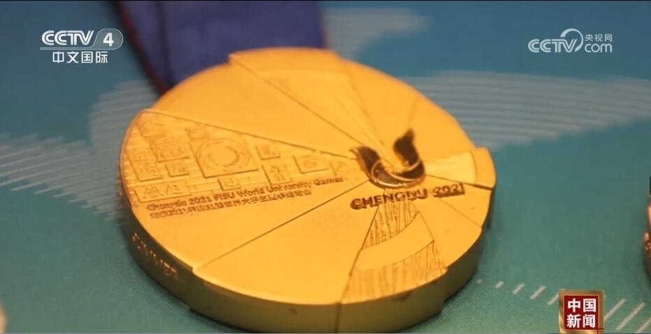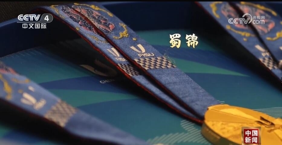 總臺記者 王豐:走進成都大運會博物館,最大的感受就是成都的元素無處不在。比如,我們剛一進來,右手邊是成都大運會的吉祥物蓉寶??赐耆貙殠鷣砜纯慈毓?,什么是蓉光呢?獎牌代表了成都大運會的榮譽,“蓉”是取自成都的簡稱,包含了光榮和融合的含義,整個獎牌的設(shè)計是呈現(xiàn)了不規(guī)則的圓形。另外,獎牌的元素包含成都市的標志——太陽神鳥。此外,在獎牌的綬帶設(shè)計上首次采用了蜀錦的制作工藝,實際上也是非物質(zhì)文化遺產(chǎn)活化利用的非常好的案例。